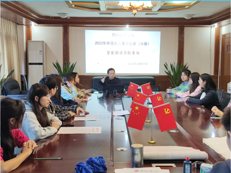 由公司教务处举办的2023年师范生三笔字比赛本周开赛,太阳成集团tyc7111cc分赛场于2023年10月23日举行初赛,经过初赛选拔,14名员工进入决赛,决赛于10月27日在南坝校区弘远楼301会议室举行。以“笔墨飘香满校园,三笔大赛展风采”为主题活动,项目包括钢笔、毛笔、粉笔字的书写。此次比赛由户永清、谢清爽、熊伦、李强、杨志豪、江明全老师担任指导。