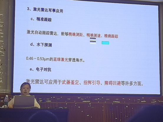 讲座中,虞静老师具体围绕了激光雷达的发展,应用和布局三方面进行讲述。激光雷达,顾名思义是为了探测物体或者军事用途,激光和雷达相结合大大提高了国防水平和工作效率。中国的雷达技术在最近几年突飞猛进,但与国外仍然存在很大的差距,所以需要同学们新时代的努力和付出。激光也是一种尖端的科技,蕴含着巨大的潜力,激光能够传输信息和迅速抵达目标地,对于消息传输和信息发送意义重大,中国目前对于激光技术的布局也是比较全面,军民商各自都有使用,例如安防监控,智能汽车,扫地机械人诸多方面,十分的贴近生活和日常。激光影响着生活,和我们的发展密切相关,所以激光的发展尤为重要,也是国家的重要战略布局,是国家强大的基石和保障。