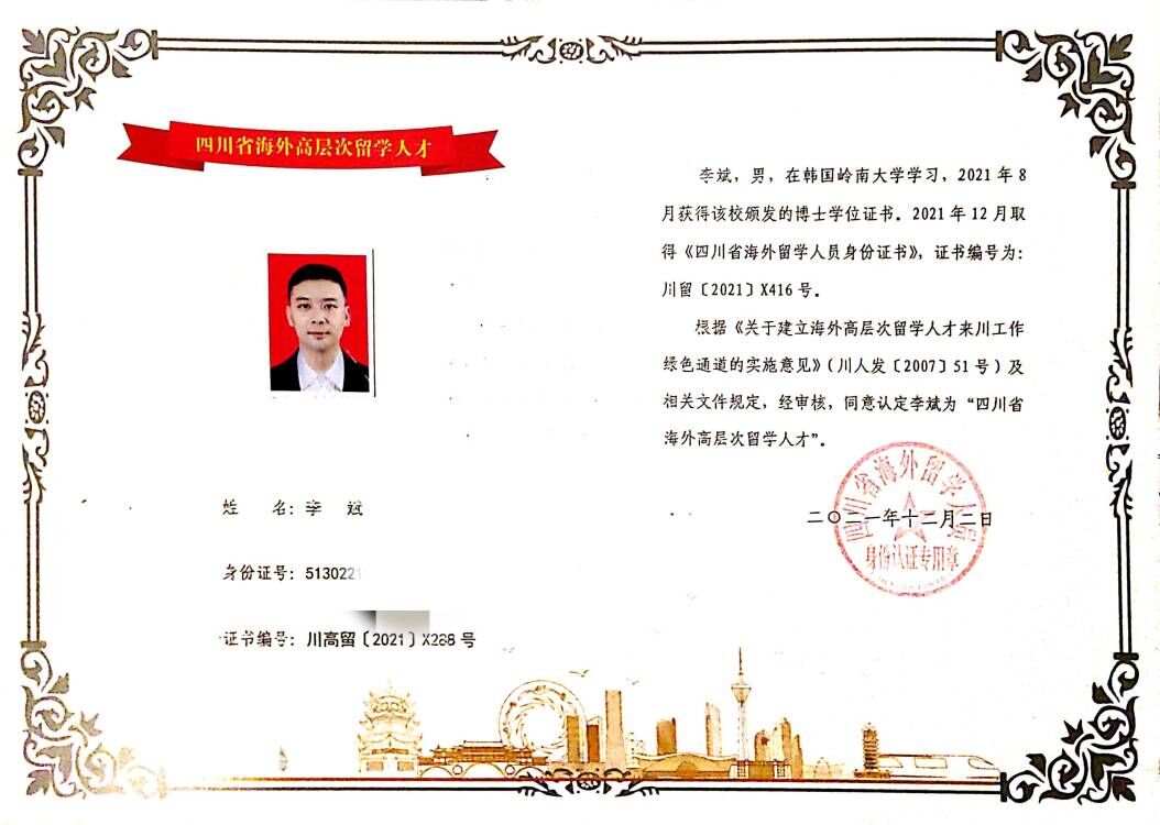 公司李斌博士2021年8月获得韩国岭南大学博士学位,2021年12月取得《四川省海外留学人员身份证书》。