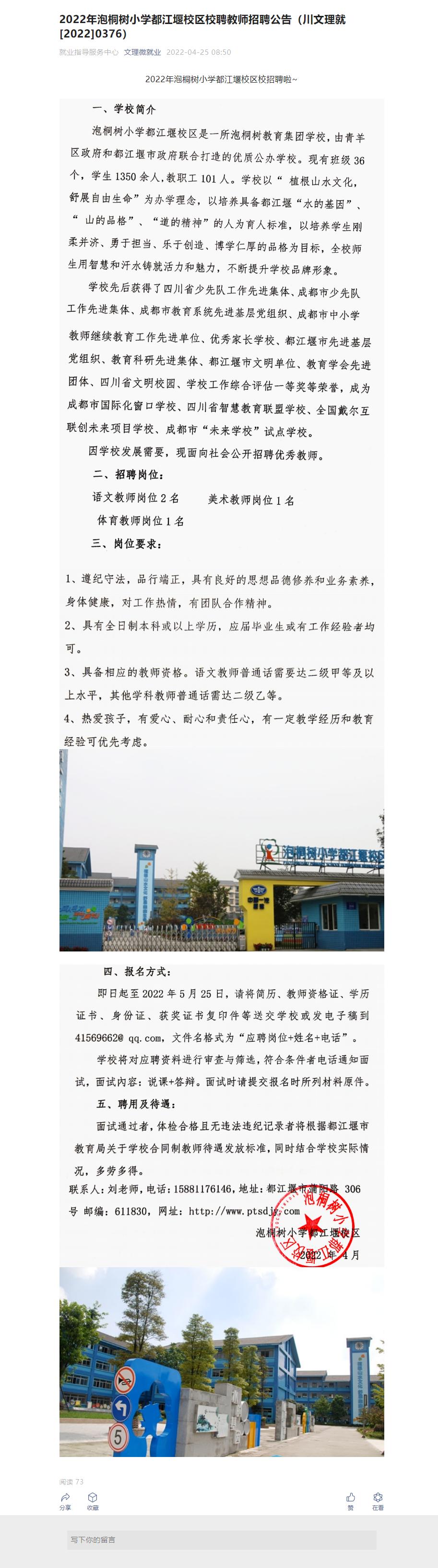 2022年泡桐树小学都江堰校区校聘教师招聘公告(川文理就[2022]0376)