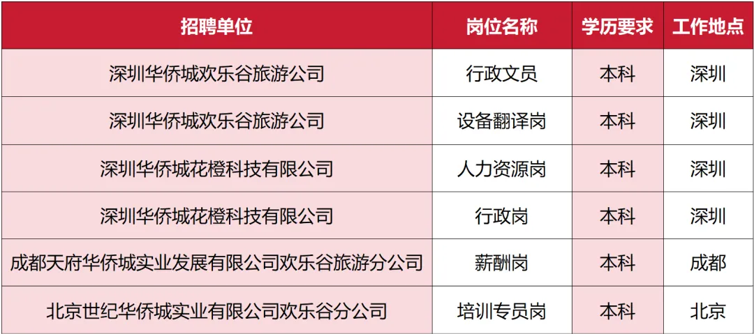 本次欢乐谷公司本部及所属企业招聘若干人,包括中层管理类、财务成本类、品牌营销类、运营管理类、专业技术类、综合管理类岗位,具体岗位职责、人数和岗位要求等信息详见《欢乐谷公司本部及所属企业招聘需求表》(扫描文末二维码)。