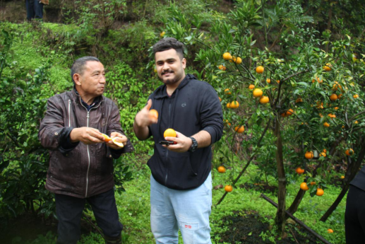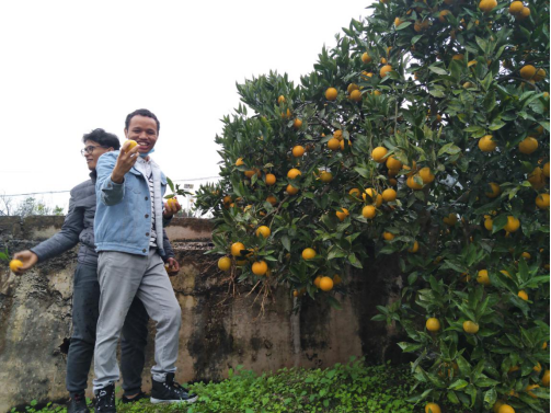 师生一行到达桂花村后,受到了村民的热烈迎接。赵家镇桂花村村支部书记田建军热情为大家介绍整个村子的村情、村貌、产业发展及发展规划。整洁的公共环境、完善的基础设施和热情好客的村民充分展现了中国美丽乡村建设的风貌,给同学们留下了深刻的印象。接着,田书记冒雨带领大家到村民家中走访,给同学们详细介绍村民的生产和生活情况。最后,大家走进桂花村万亩桔园进行农事体验,摘桔品橙。在大家进行体验的同时,不少外地游客也驾车来到桂花村旅游观光。这一系列活动都激发着职工的好奇心,他们一边村民们进行热切交谈,了解种桔摘桔的方法,一边拍照、发朋友圈,与家人视频,分享他们的见闻和喜悦。
