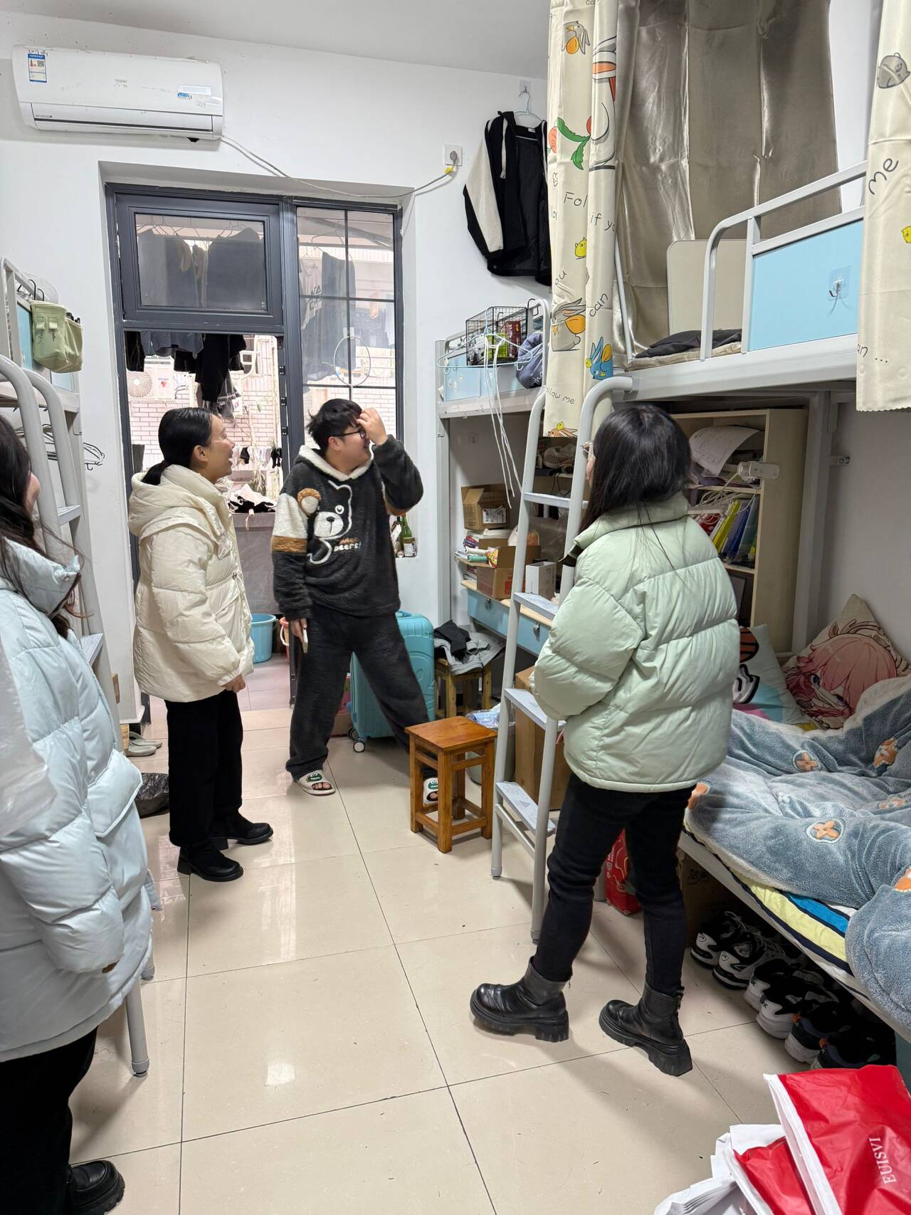1月9日下午,公司全体辅导员看望员工,为大家送上新春的祝福,并对宿舍开展安全检查,提醒员工保存好贵重物品、离开寝室关闭好门窗、并严格遵守公司宿舍管理各项规章制度,增强安全防范意识。