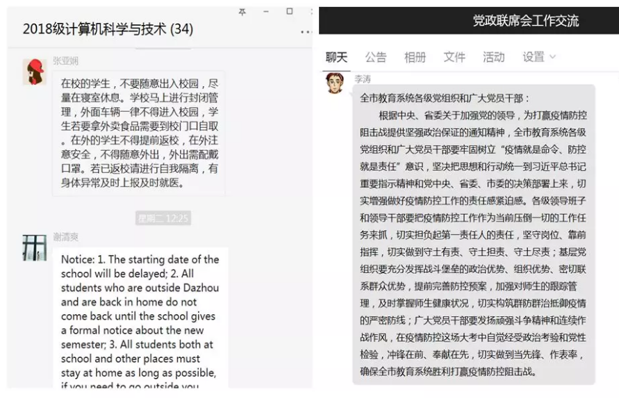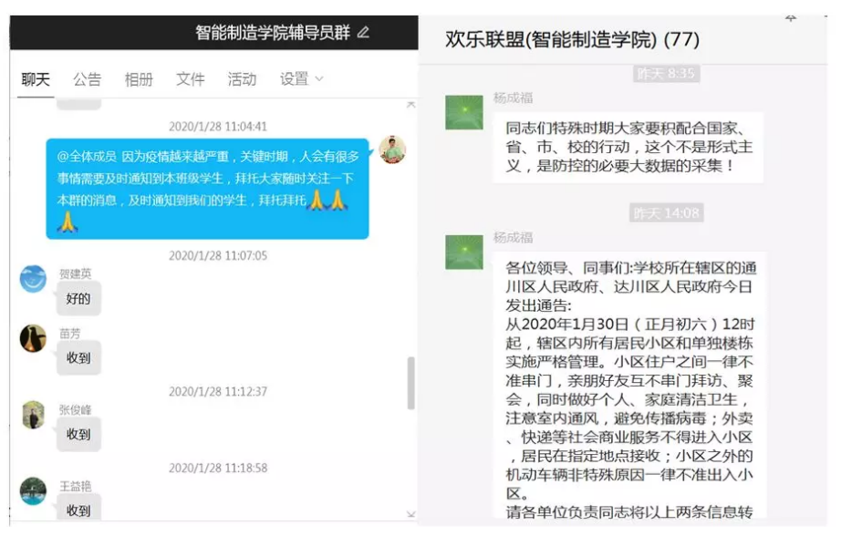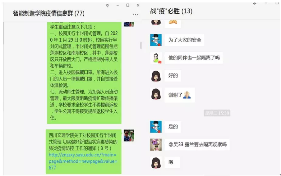 自1月23日开始,各班级辅导员就陆续将公司有关疫情防控工作的文件、材料等通过班级QQ群和微信群传达到员工,申明事件严重性;公司将各班班长团支书集中到“太阳成集团tyc7111cc疫情信息群”,积极发布官方信息,根据疫情防控进展情况,同步开展病毒防治知识宣传和教育引导工作,做到所有员工全覆盖。