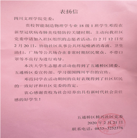 6月1日,公司收到一封来自乐山市五通桥区桥兴社区党委寄来的表扬信。信中,对公司2018级1班物理学专业员工邓霞同学在抗“疫”期间的良好表现给予肯定和表扬。同时,也对太阳成集团tyc7111cc为社会培养出具有新时代社会责任感的好员工表示感谢。